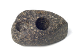 Otwory służące do osadzenia rękojeści wykonywano świdrem zakończonym pustą w środku kością lub twardym kawałkiem drewna, wprawianym w ruch obrotowy cięciwą łuku. Stosowano też podsypkę z piasku i wody. Wywiercenie otworu wymagało kilkudziesięciu godzin pracy. Nie zawsze jednak kończyło się sukcesem, jak w przypadku prezentowanego egzemplarza. Pradziejowy wytwórca zapewne trafił na przeszkodę w surowcu, która uniemożliwiała mu dalszą pracę przy wykonaniu otworu, bądź w trakcie żłobienia surowiec częściowo się rozłupał i dla zachowania proporcji należało otwór umieścić w innym miejscu. Po tym zabiegu przedmiot mógł pełnić przypisaną mu funkcję.